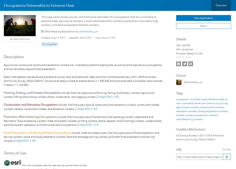 Occupations Vulnerable to Extreme Heat, a tabbed story map, shows four different categories of workers, one tab for each category, and then a final predominance map showing all four. The app’s Details page uses the same color map as the ones used in the map for the details about each occupation category, with links to the authoritative source on occupation definitions.