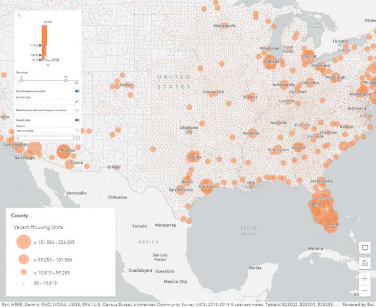 While color is best for mapping percentages or rates, size is best for mapping counts or amounts. Figure 3 uses vacant housing units as the count attribute. This attribute is notorious for having very large margins of error and consequently very large ranges.