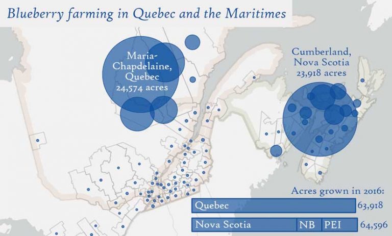 In 2016, Quebec and the Maritimes were almost perfectly tied for dominance in blueberry farming, so I added a chart to illustrate this.