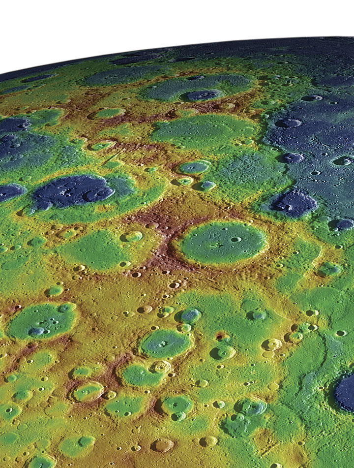 Byrne: The majority of Mercury’s surface is composed of solidified lavas that have been substantially reworked by subsequent asteroid impacts, whereas most of the lunar surface is made up of a material that formed very early in the moon’s development and is chemically very different from Mercury’s lavas. We can make these comparisons because we have enormous volumes of chemical data for Mercury, which we can plot into global elemental abundance maps, for instance. And from measuring the number of craters per unit area on both Mercury and the moon, we can tell that, although lavas poured onto the surface of the moon over several billion years, the resurfacing of Mercury by lavas ended globally at around the same time, almost four billion years ago. MESSENGER scientists are still working to figure out why, but it may be a result of the planet starting to cool and contract, which squeezed shut the conduits that magmas were able to exploit on their way to the surface.