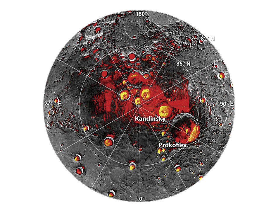 Byrne: We’ve had such a successful mission with MESSENGER that it’s impossible to say which one discovery is the most important. There have been so many. For example, MESSENGER data have been used to produce maps of so-called permanently shadowed craters—craters near the poles in which sunlight literally never reaches the crater floors. Inside many of these craters, MESSENGER spectrometer, altimeter, and image data together show that not only are there deposits of organic, volatile compounds present but also deposits of water ice. We’ve even been able to directly image some of these exposed ice deposits. That ice had been identified from radar measurements taken from Earth long before MESSENGER and had even been hypothesized to be water ice, but to confirm that hypothesis with multiple datasets was a major achievement of MESSENGER’s mission.
