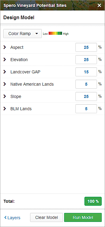 Click the Run Model button. In the Save Model dialog box, name the model Spero Vineyards Potential Sites and click Save.