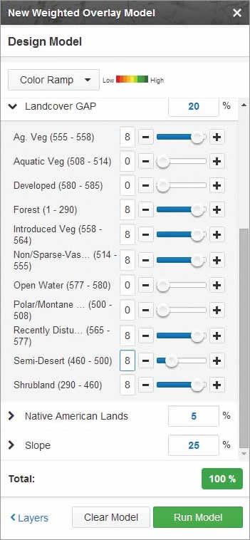 Check the boxes beside the Aspect, Elevation, Landcover GAP, Native American Lands, and Slope layers to turn them on. Click the Design Model button.