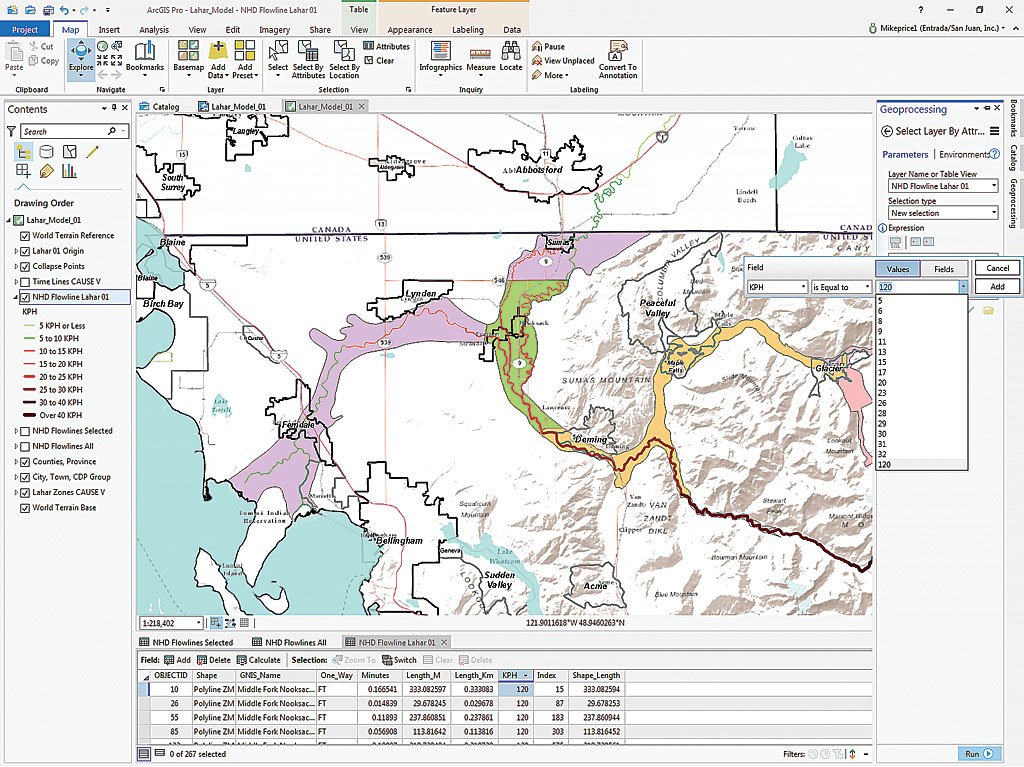 In the Contents pane on the left side of the interface, highlight NHD Flowlines Selected, right-click, and open its attribute table. Select individual records and study their attributes. Zoom in to check NHD flowlines in and near the communities of Everson and Nooksack. There is a very low drainage divide between the Nooksack River and Johnson Creek. The CAUSE V model will deflect part of the lahar flow out of the Nooksack drainage into the Johnson Creek/Sumas River drainage, and the flow will continue across the border between the United States and Canada and flow toward the Fraser River.
