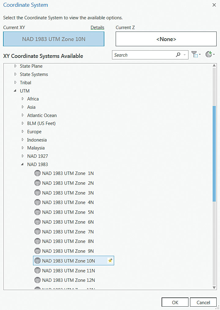 It is very important to set the Coordinate System to North American Datum 1983, Universal Transverse Mercator Zone 10N (NAD_1983_UTM_Zone_10N). Click the globe icon and in the Coordinate System pane, choose Projected > UTM > NAD 1983 > UTM Zone 10N.