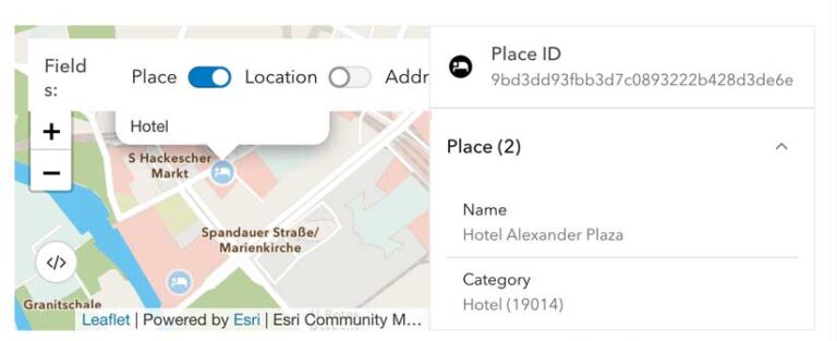 Your users can easily obtain additional information about a place, beyond the information provided by search responses using the Esri Place ID (PlaceId). Each returned record includes a persistent identifier—PlaceId—that can be submitted, along with the list of desired fields (requestedFields), to the places endpoint to obtain additional place details, if they are available. Additional information can include: