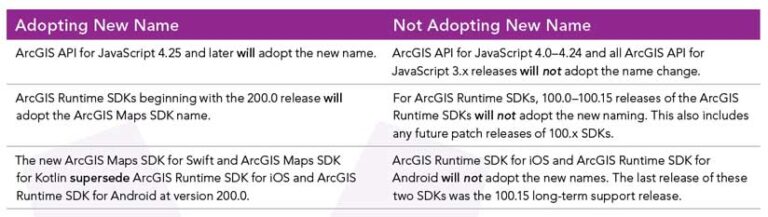 Although only the names will change, it’s worth reiterating some of the things that won’t change. Capabilities of the APIs/SDKs will remain the same. Namespaces, class names, methods, properties, and include statements will all stay the same. If you use a package manager, you’ll continue to reference the same packages. If you’re linking to ArcGIS Runtime SDK binaries, nothing will change.