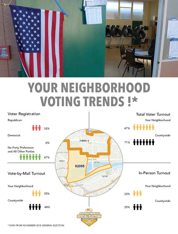 The Your Voter Registration page on the OCROV websites uses GIS behind the scenes to provide voters with the correct polling place, information on the districts in which they reside, and information about their elected officials. Voters can also use the site to apply for a vote-by-mail ballot, download a sample ballot, or opt out of receiving a sample ballot. These outreach efforts have had a positive effect: the turnout for the 2018 midterm election hit a historic high of 71 percent.