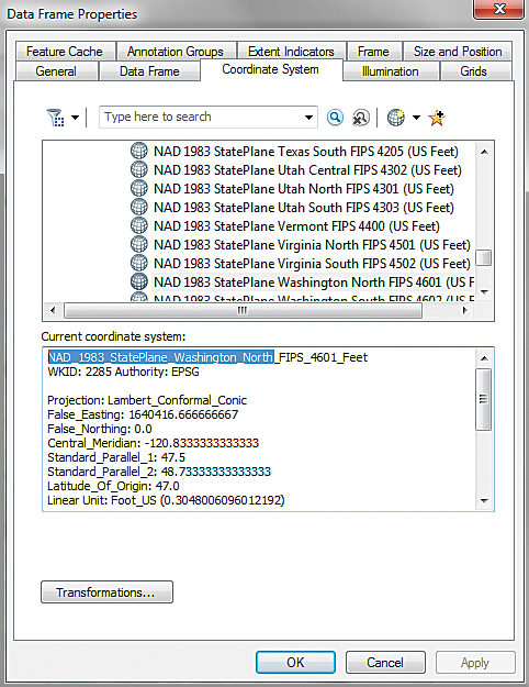 The first data loaded in the data frame that has projection information will define the coordinate system for the data frame. When adding the first data layer, verify that it is projected and correctly defined in the coordinate system that you want to use.