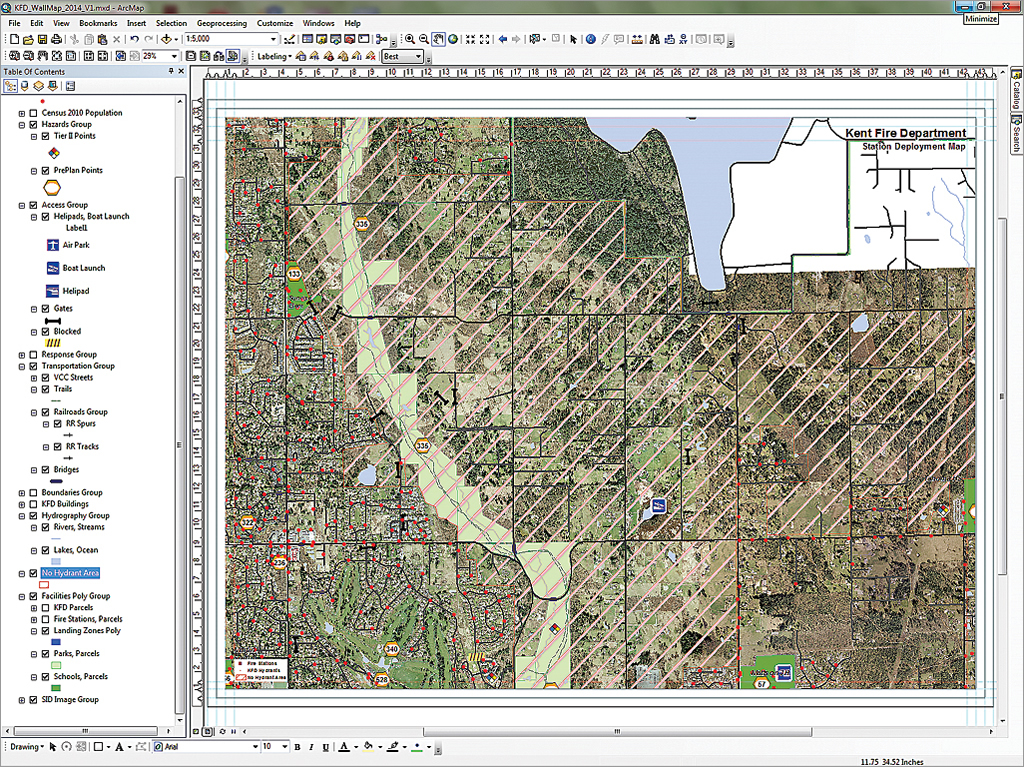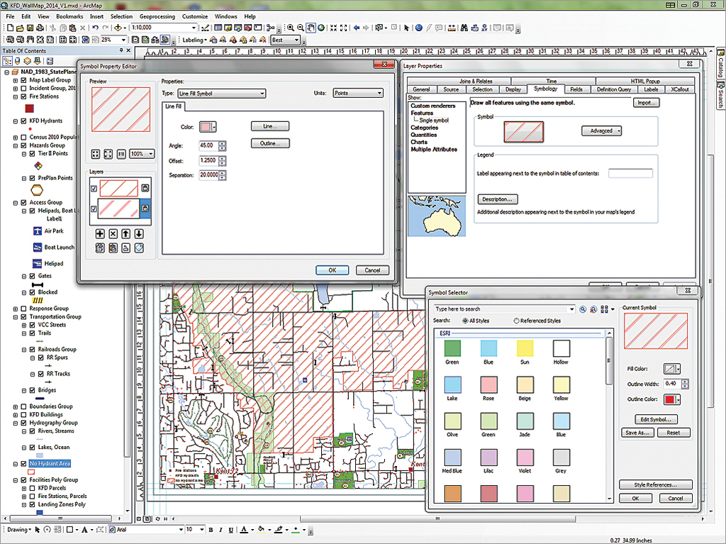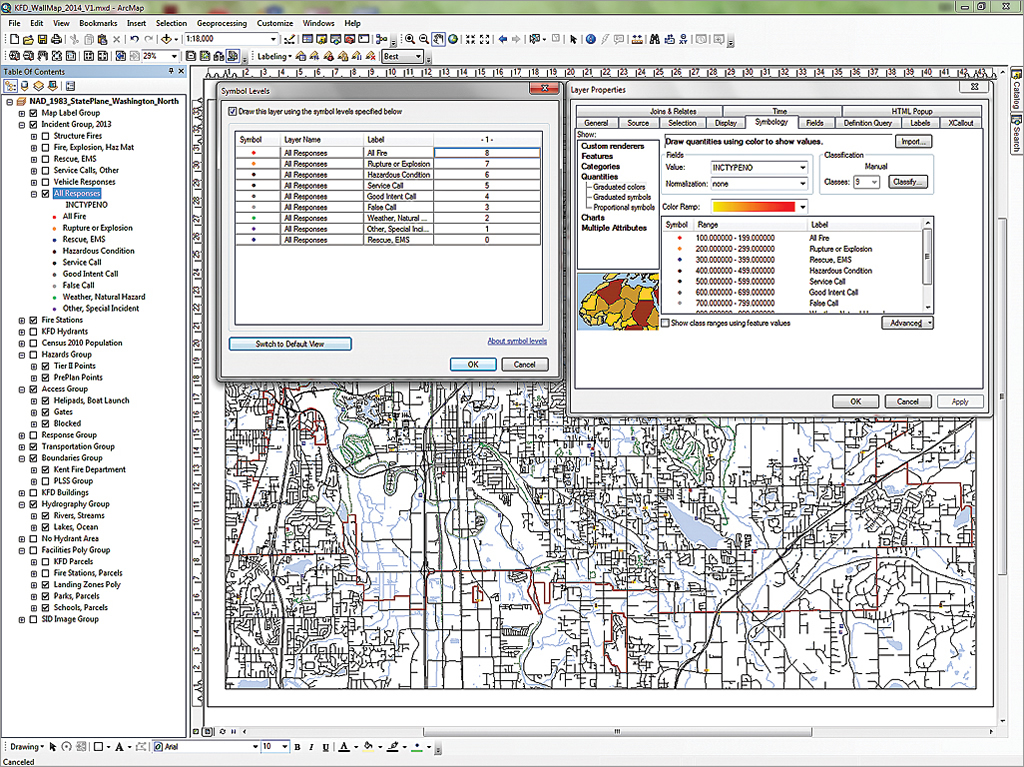 Rather than a tutorial, this article shares shortcuts and insights and does not require a training dataset. Illustrations were made using examples from a wall map developed for the Kent Regional Fire Authority (KRFA), Kent, Washington. The data has been simplified and standardized for public display and future training purposes. Much of this data will be used in the Esri Fire GIS University program, which will be rolled out in Redlands, California, in late January 2015.