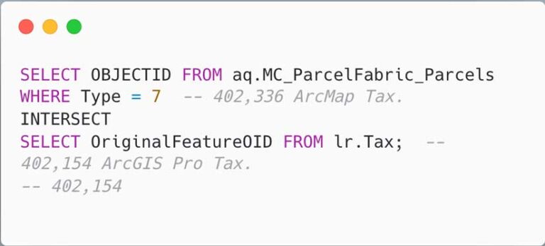 The difference between the number of ArcMap and ArcGIS Pro parcels was 182. Why didn’t these parcels migrate? He ran the SQL statement shown in Listing 2 and found that all 182 tax parcel polygons had zero area and perimeter length so that they did not migrate.