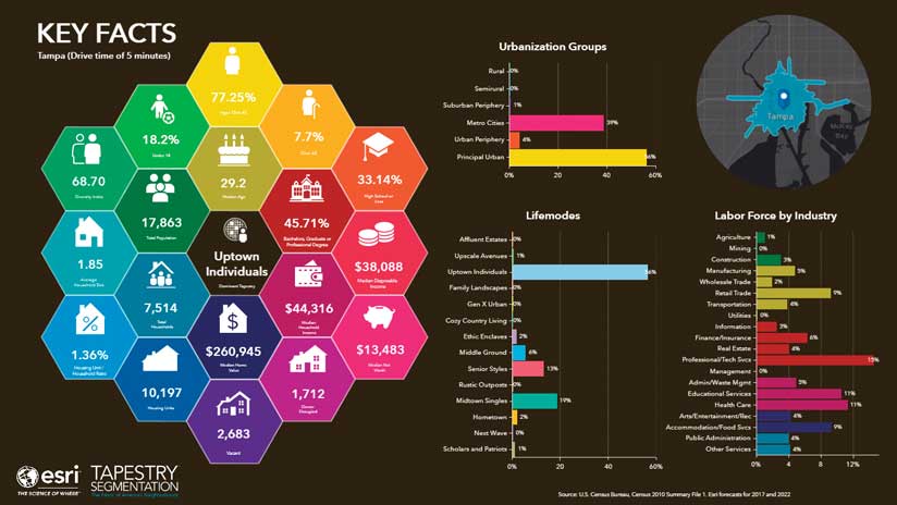 Infographics summarize key facts in a way that is easily digested by the reader and turn hundreds of words into easily understood facts. ArcGIS Community Analyst provides a growing library of professional infographics and templates that improve the way you tell the story of your community.