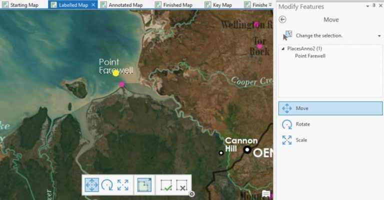On the ribbon, on the Edit tab, click the Move button. Click the text for Point Farewell and drag it into a better position. Click Finish (with the green check mark) on the toolbar when you’re happy with the placement.
