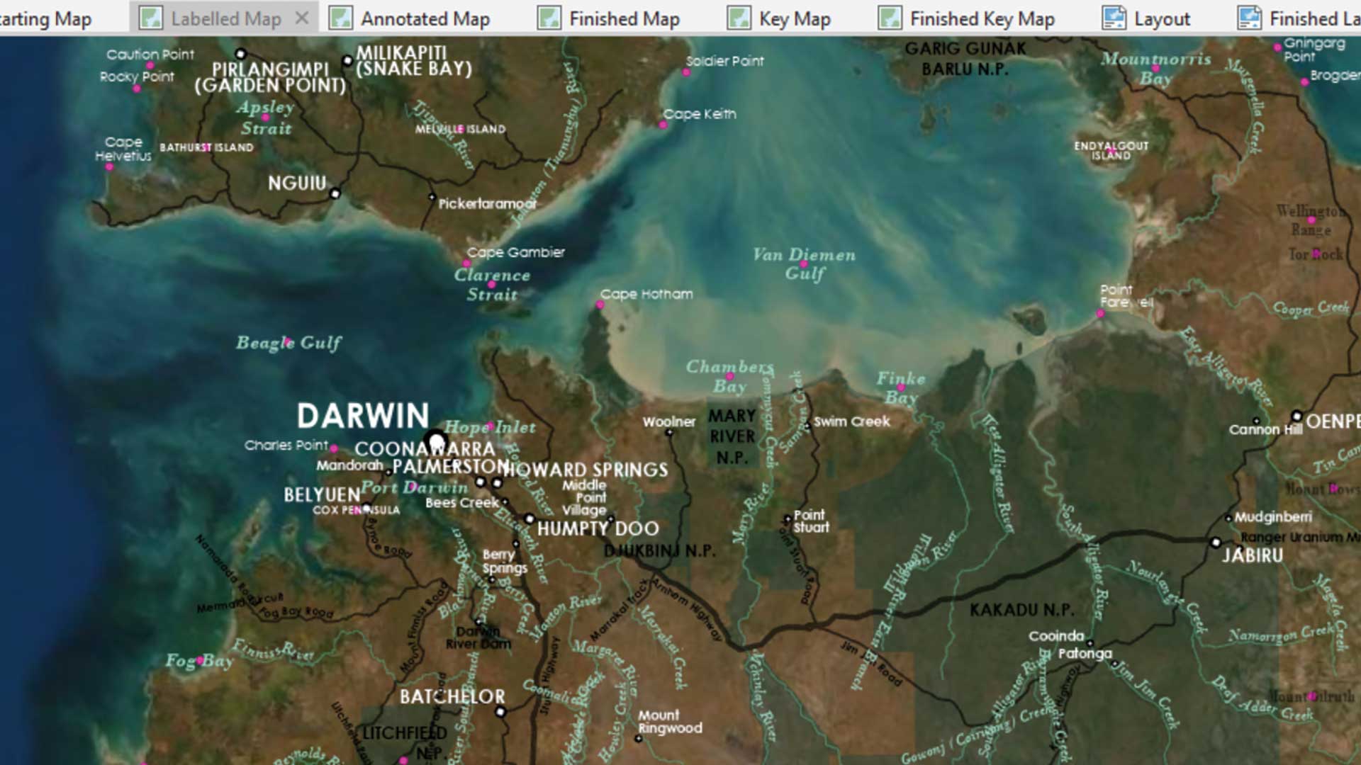 What you need to do next is eliminate many labels. If you’re going to do that properly, you need to research the area to find out which features are important and which are not. You can look at other maps in atlases or on the internet to guide you. I have already done this work on the place-names for you. (My apologies to the people of Darwin if I chose poorly!) But there are still plenty of river and road names for you to delete.