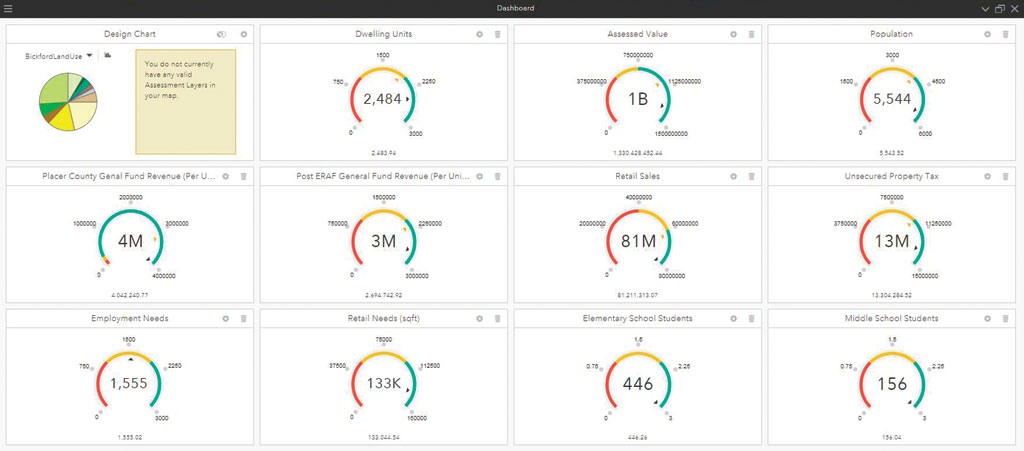 Non-GIS professionals at Placer County use GeoPlanner to draw and paint different land-use scenarios. As planners and analysts change land-use patterns—such as from low- to high-density residential—KPIs immediately reflect changes in revenue and expenditure estimates. Placer County’s GIS group uses GeoPlanner to develop the layer of base land use and build out the KPIs.