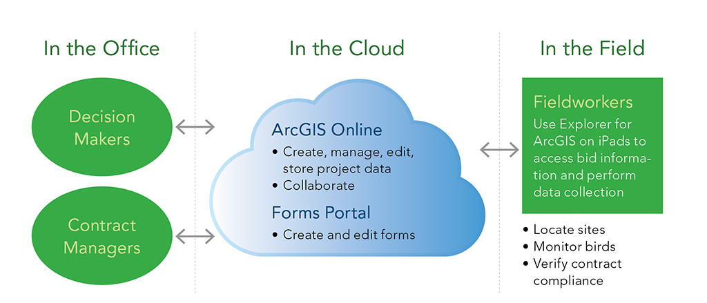 TNC relies on a suite of geospatial, cloud, and mobile technologies to implement the BirdReturns program efficiently—from ArcGIS Online for collaborative web mapping and program design to the Explorer for ArcGIS app, which supports the field teams with an interactive mobile map, to digital forms that are used by field teams to collect data on mobile devices.