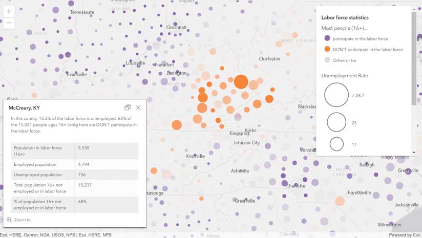 Similar in syntax and simplicity to spreadsheet formulas, Arcade is a powerful tool that lets you display and visualize information beyond what is immediately available in a dataset by visualizing and displaying new data values. These data values are calculated on the client side and can be formatted the way you want even if you don’t own the layers containing the data.