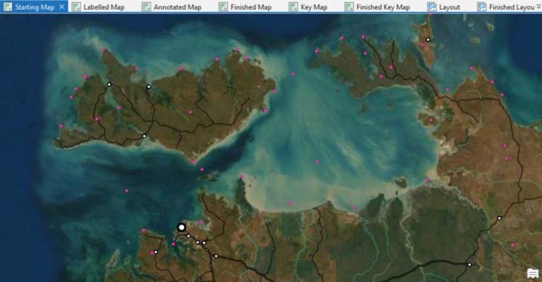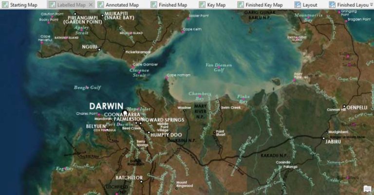 Text can make or break a map. There are three kinds of text on maps made with ArcGIS Pro: labels, annotation, and layout text. This tutorial will help you improve your labeling skills. You can follow along with this tutorial (to whatever degree of perfection you prefer) using the Darwin.ppkx project package. By the end, you will have a map of the region around Darwin in Australia’s Northern Territory that you can convert to annotation in the following companion tutorial in this issue of ArcUser, “Place Text Exactly Where You Want with Annotation in ArcGIS Pro,” which shows you how to refine the map by converting labels to annotation.