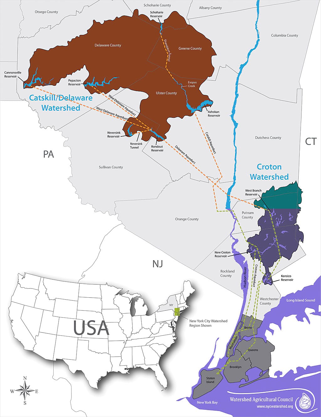 The New York City Watershed is the largest unfiltered surface water supply system in the United States. Every day this region in upstate New York’s Catskill Mountains provides more than a billion gallons of clean drinking water to the more than 9 million people residing in New York City and upstate counties. The system includes 19 reservoirs, three controlled lakes, and a watershed that spans more than a million acres. In some cases, water travels more than a hundred miles to reach New York City.