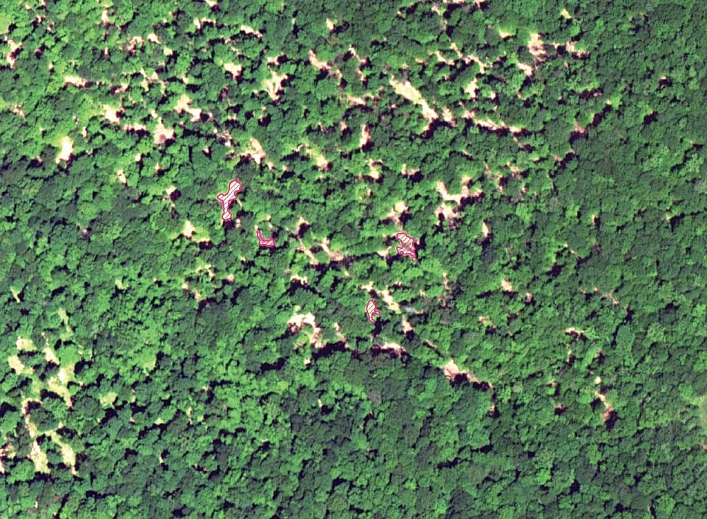 To improve these initial results, Feature Analyst allows the user to indicate sample areas that the software got right or wrong. Feature Analyst then uses this information to learn what the user is looking for. After several rounds of this learning process, the software became better at identifying canopy gaps. Once Feature Analyst could reliably identify canopy gaps, the software’s batch processing function allowed analysis of multiple aerial photos automatically. WAC identified properties where logging occurred by overlaying Feature Analyst’s results with county tax parcel layers. The organization only works on private lands, so they excluded tax parcels owned by government agencies.