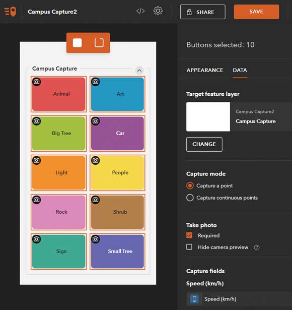 Press the Shift key and click to select all the buttons. Selected buttons will be outlined in orange. With all buttons selected, open the Appearance tab and choose the large button size. Click the Data tab and enable photos by sliding the button. Save the project. Click Share to make the project available to all members of your organization.