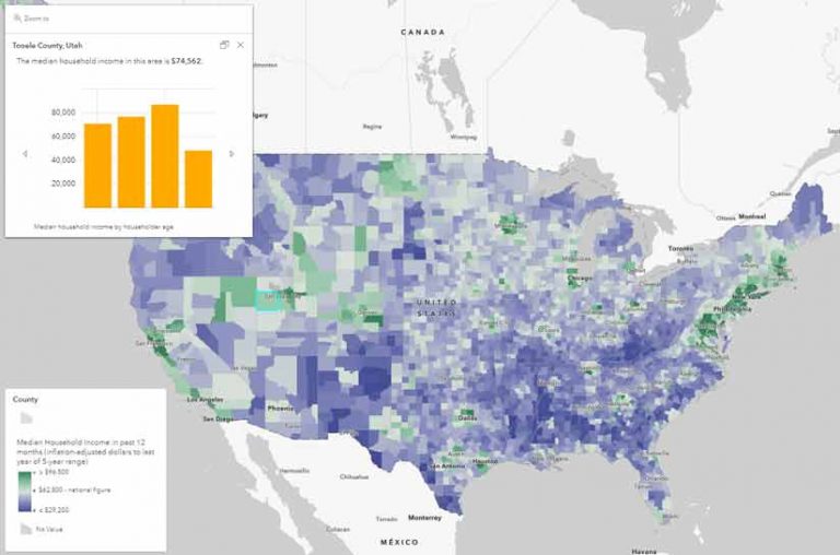 You can quickly map more than 1,700 ACS attributes covering a wide range of demographic topics such as income, housing, age, race, and education. Each layer maps an interesting subject with informative pop-ups. You can immediately see important patterns anywhere in the United States or Puerto Rico. You can also use the layers to create your own customized web maps and applications to tell an endless number of stories about the population or housing in an area.