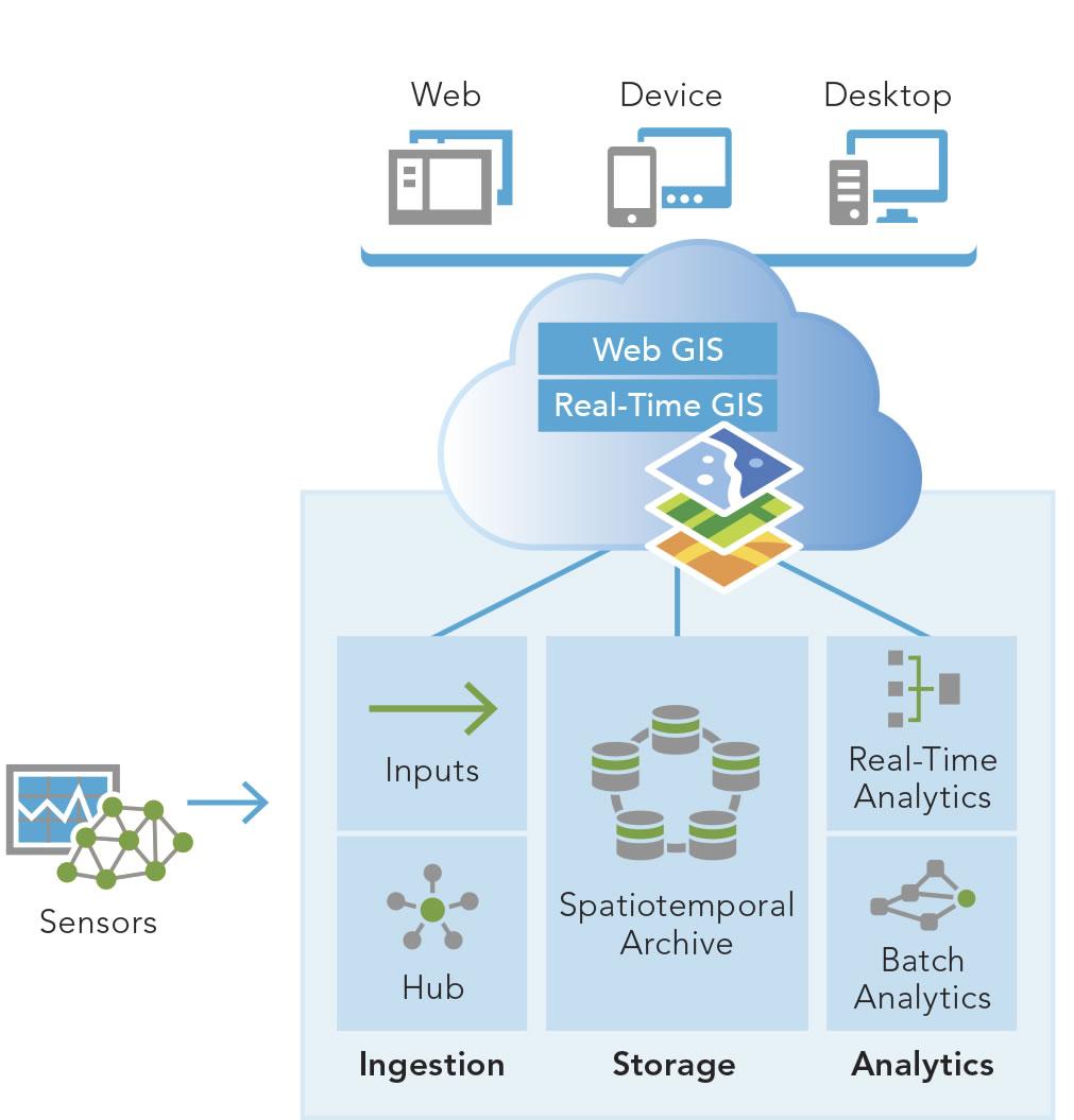 You can use Real-Time GIS to ingest real-time data streams from in-vehicle GPS devices, sensors, mobile devices, and social media providers. It accommodates multiple streams of data flowing continuously through filters and processing steps that you define so you can focus on only the most important aspects of your operations. It can track dynamic assets that are constantly moving (vehicles, aircraft, vessels, and people) or stationary assets that have attributes that constantly changing (pressure valves on a pipeline and weather monitoring stations).