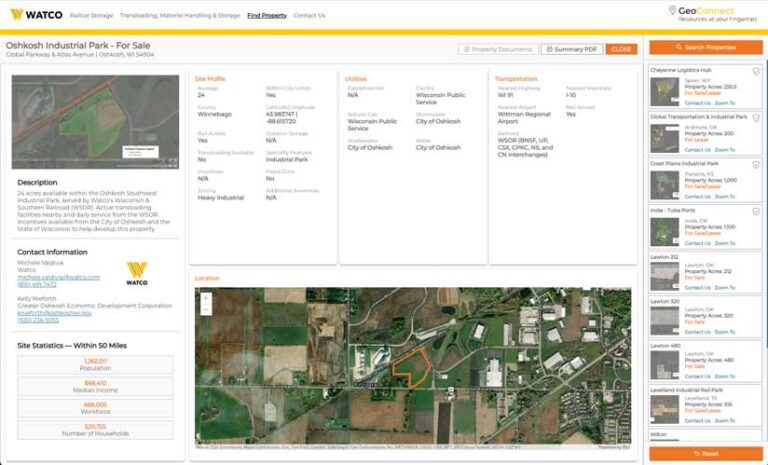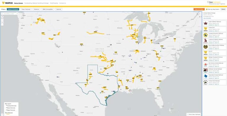 “GeoConnect has revolutionized the way customers explore railcar storage and transload solutions at Watco. In a crowded marketplace, GeoConnect stands out, offering potential and existing customers an intuitive way to identify premier sites, railcar storage locations, and transload options,” said Aaron Baumgarden, manager of GIS programs at Watco.