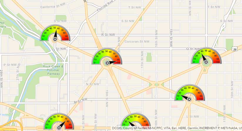 Rotation can be applied to any feature layer in your map. Symbols can be stacked to create a gauge with a dial. Symbol rotation is used to rotate the dial. For more information, see “Creating dials and gauges using stacked symbols and rotation.”