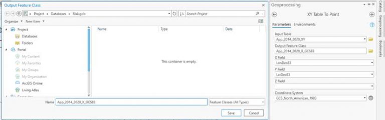 In the Geoprocessing pane, click on Environments. Set the Output Coordinate System to GCS_North_American_1983 using the same process as previously described and click Run. Once it is finished importing, open the App_2014_2020_X_GCS83 attribute table and save your project.