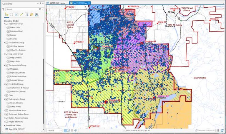 In April 2018, GF&R prepared and submitted a large request to the Federal Emergency Management Agency’s (FEMA) Staffing for Adequate Fire and Emergency Response (SAFER) grant program to expedite hiring of up to 21 line personnel and 5 new 24/7 firefighter positions. The $3.5 million grant, awarded in late summer 2018, provides 75 percent reimbursement for new personnel costs in the first two years and 35 percent reimbursement in the third year. The ArcGIS-based mapping and modeling that supported this grant request was featured in two ArcUser articles: “Mapping Current and Proposed Effective Fire Response” in winter 2019 and “Migrating Public Safety Workflows to ArcGIS Pro” in spring 2019.