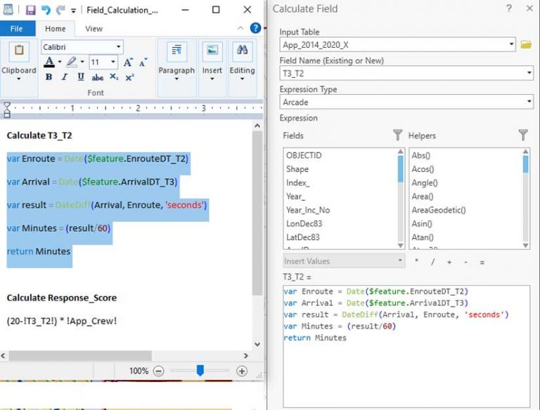 It is standard practice to calculate travel time in decimal minutes by simply subtracting date/time en route values from arrival times and multiplying the difference by 1,440, which is the number of minutes in a 24-hour day. This conversion is incorporated into the Field_Calculation_Scripts that has been included in the sample dataset for this exercise. This RTF file contains an ArcGIS Arcade script for calculating time interval and a Python script for calculating response scoring.