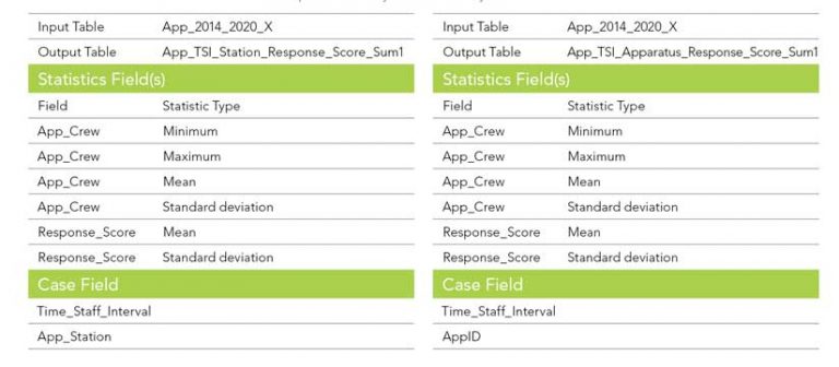 You will use the Response_Score, App_Crew, Time_Staff_Interval, App_Station, and AppID fields to summarize and measure apparatus-level response of four staffing intervals (Time_Staff_Interval). You can prepare multiple summaries for each responding station (App_Station) and for individual apparatus (AppID). This is a huge benefit because concatenated summarize-only fields are not required. (Also pivot tables are available only in ArcGIS Pro Advanced.)
