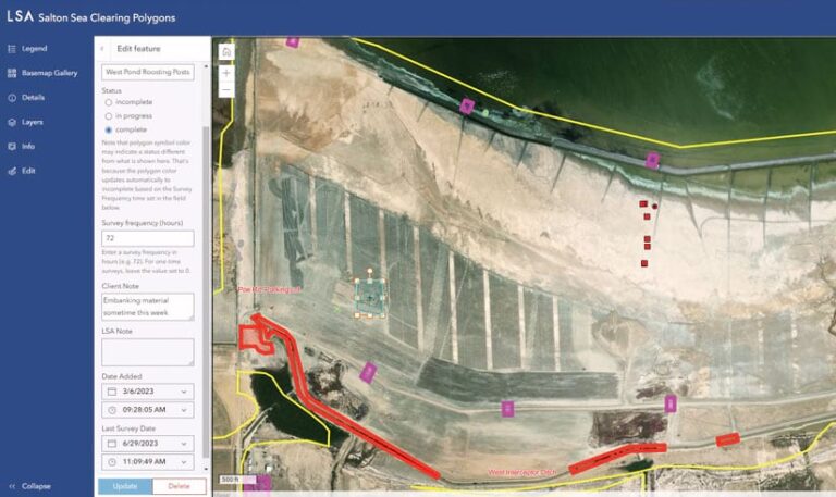 “Kiewit and our project manager use the ArcGIS Instant Apps Sidebar to communicate priorities to our field biologists. They draw new nesting bird survey area boundaries and update their status each week,” said Torpey.