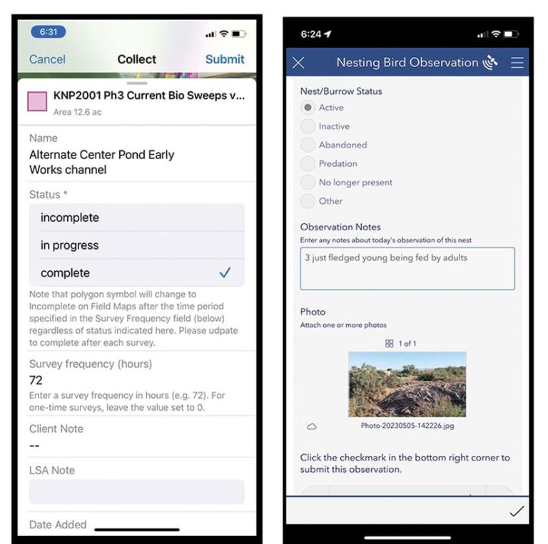 “Our biologists record detailed observations about nest location, status, and activity,” said Holly Torpey, senior GIS specialist/developer at LSA. “In addition, they report on the presence of adults, eggs, chicks, fledglings, and bird mortality. We monitor both resident and migratory nesting birds and record observations of any special-status species spotted within the site.”