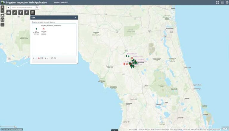With the new workflow, EPD incorporated data from other agencies including University of Florida’s (UF) H2OSAV data and Gainesville Regional Utilities (GRU) reclaimed water lines data. [H2OSAV (Water Savings, Analytics & Verification) is a UF Institute of Food and Agricultural Sciences (IFAS) Extension program that is working to measurably save Florida water. GRU is a multiservice utility owned by the City of Gainesville, Florida.] These feature layers were also added to Field Maps.