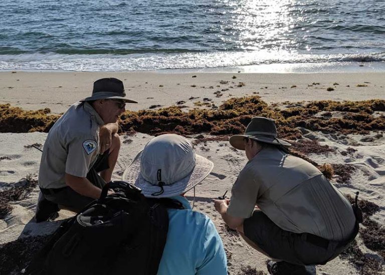 For the past 40 years, between March and October, early risers along Florida’s coastline may see groups of people walking the beach, heads down, and focused on the sand. They occasionally stop, kneel, point, and take notes. These people are data collection teams purposefully searching the beaches to find and identify evidence of sea turtle activity.