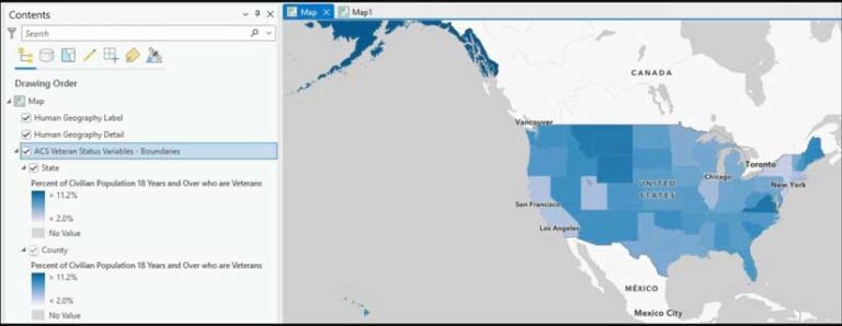 This layer is also symbolized to show the percent of the adult population with veteran status. Darker blue areas have a higher percentage of adults who have formerly served in the US military. Notice that the state of Virginia is one of the darker blue states, indicating a large percentage of veterans.