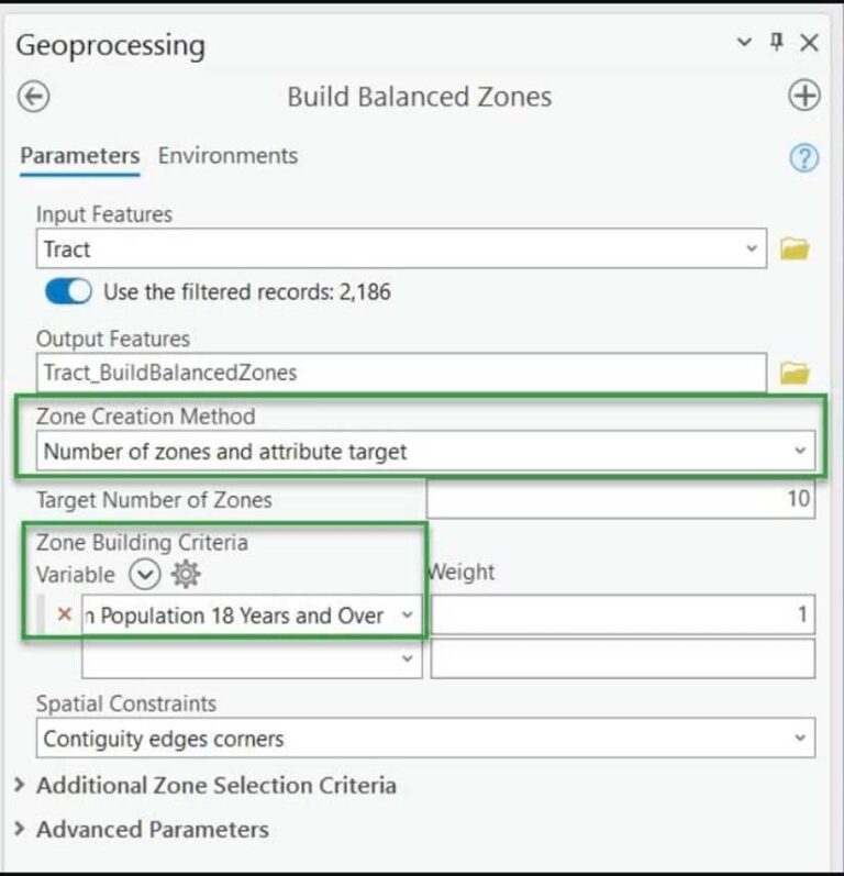 Point to Zone Creation Method and click the i button that appears next to it. Read the detailed information about this parameter in the window that appears. Here’s where you input whether you want an attribute target (e.g., as balanced as possible for a specific attribute), or a defined number of zones (e.g., 10 zones and only 10 zones), or both. The defined number of zones option is helpful when you have a fixed number of resources, such as regional directors, campuses, or field offices. For this exercise, change the drop-down option to Number of zones and attribute target. For Target Number of Zones, type in 10.