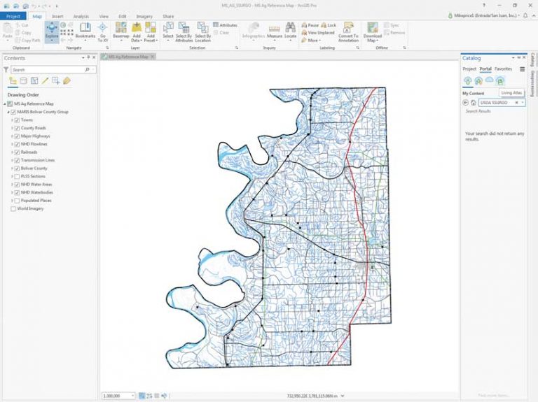 Start ArcGIS Pro, navigate to MS_AG_Technology, and open MS_AG_SSURGO.aprx. Inspect the MS Ag Reference Map of Bolivar County, which was built using vector data downloaded from the Mississippi Automated Resource Information System (MARIS) data site.
