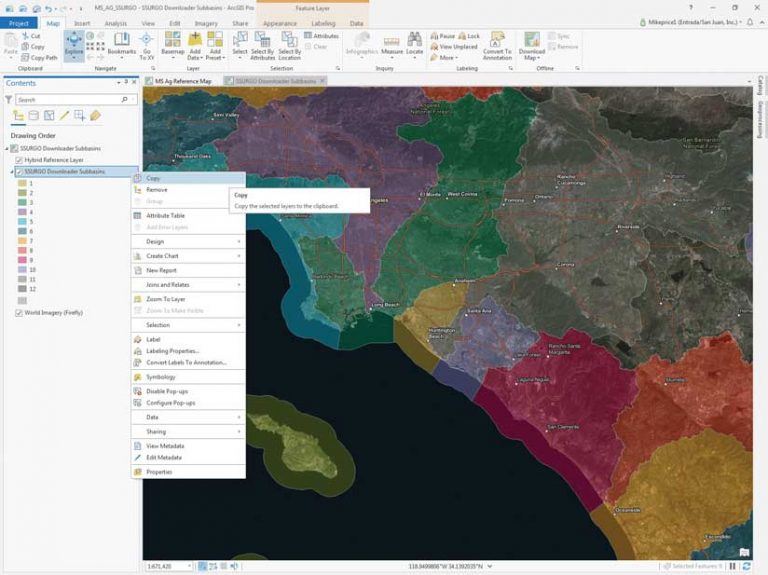SSURGO Downloader Subbasins will open in a new map, zoomed in to Southern California. Copy this layer into MS Ag Reference Map by right-clicking SSURGO Downloader Subbasins (choose the web map, not the feature layer) and selecting Copy.