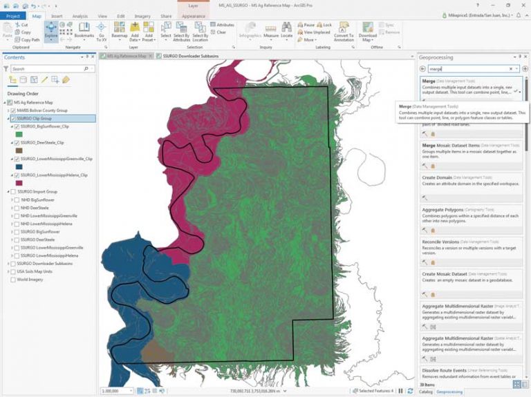 Open the Geoprocessing pane and search for “merge” and choose Merge (Data Management Tools). Click the down arrow next to Input Datasets to add many datasets. Check the boxes next to all four clipped subbasins in the SSURGO Clip Group and click Add to add them. Set the Output Dataset path as MS_AG_Technology\MS_AG_Technology\SSURGO\SSURGO.gdb and name it SSURGO_Bolivar_Merge_Raw. Verify that Merge Rule is set to First and all SSURGO Clip Group\ parameters are set to areasymbol. Click Run to merge four soil sets. Once merged, inspect the SSURGO_Bolivar_Merge_Raw, place it in the SSURGO Clip Group, and save the project.