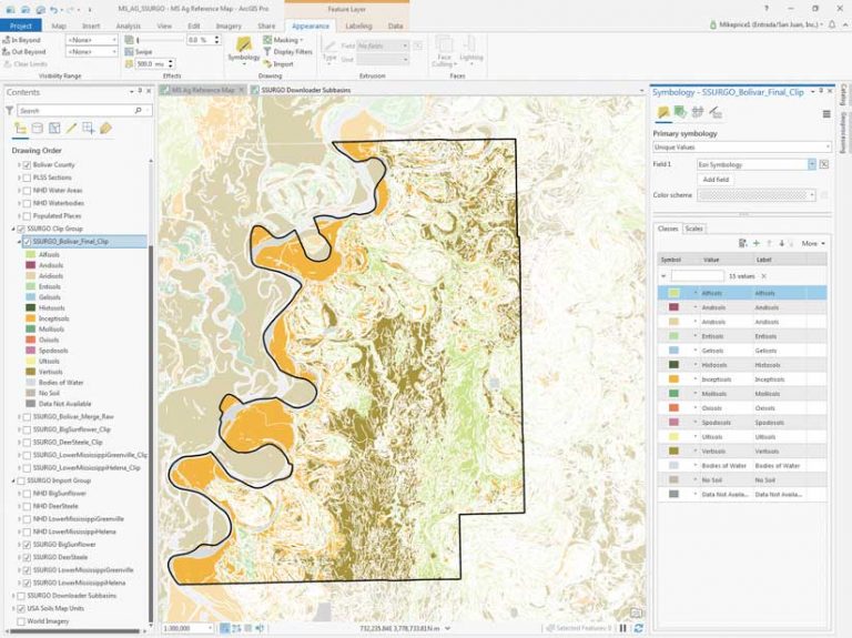 \MS_AG_Technology\MS_AG_Technology\SSURGO and locate USA Soil sMap Units.lyrx. - Add this file to the tool and specify esrisymbology as the Source Field and Esri Symbology as the Target Field. Click Run. This will apply standardized SSURGO symbology to SSURGO_Bolivar_Final_Clip. Inspect the resymbolized Bolivar SSURGO layer. Inspect the polygon symbology assigned to soil types.