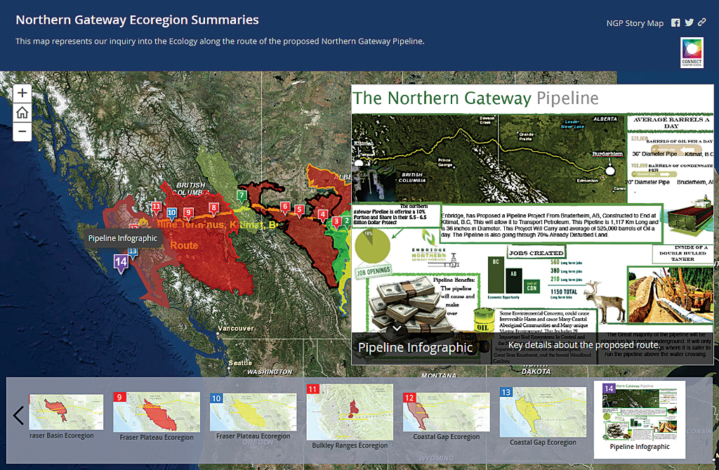 Using the Esri Story Map template, the class created Northern Gateway Ecoregion Summaries, an interactive Story Map that summarized each group’s final decision. Students said the online GIS technology made learning the project’s subject matter more interesting and authentic.