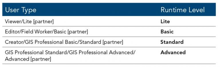 User types can now enable all levels of ArcGIS Runtime licenses via an ArcGIS Online or ArcGIS Enterprise named user login. Named user logins now enable Standard and Advanced level licenses. A new Runtime Analysis extension can also now be assigned as an add-on to Creator and GIS Professional user types. These user types include a Runtime Standard or Advanced license.