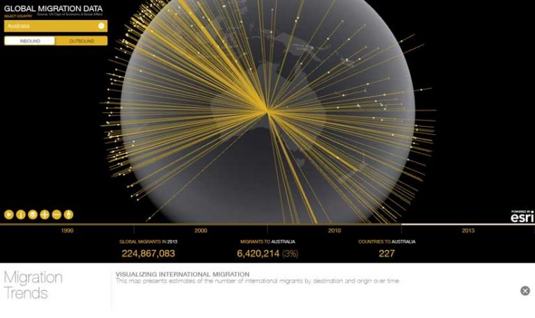 The Esri Cool Maps gallery features this 2D and 3D map visualization of incoming and outgoing migration, organized by country, for four different time periods. The map presents estimates of the number of international migrants by destination and origin. The map uses a dataset called Trends in International Migrant Stock from the United Nations Department of Economic and Social Affairs.