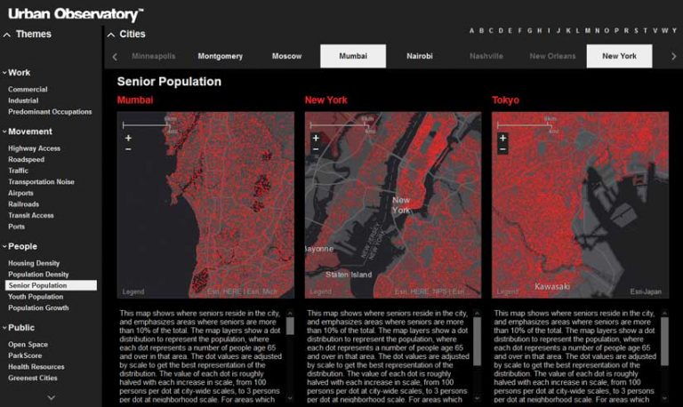 Urban Observatory is a mapping and visualization app that enables you to compare conditions—including housing density, traffic, youth population, and open space—for more than 100 cities around the world.
