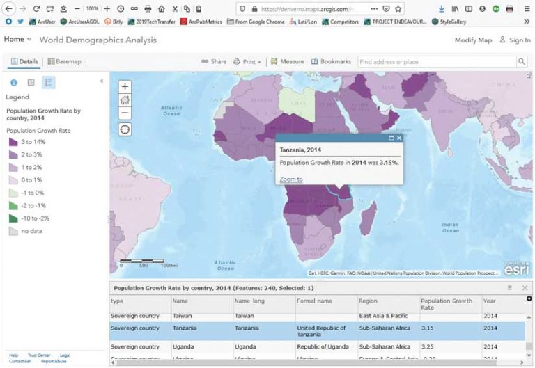 This World Demographics Analysis web map includes some Living Atlas content and opens the door to investigating population growth rates, life expectancy, birth rates, and other variables. Some of the variables can be analyzed over time by opening the table associated with the maps and using the time animation slider. For additional analyses, modify the map below by clicking on it and adding other layers from the Living Atlas or ArcGIS Online.
