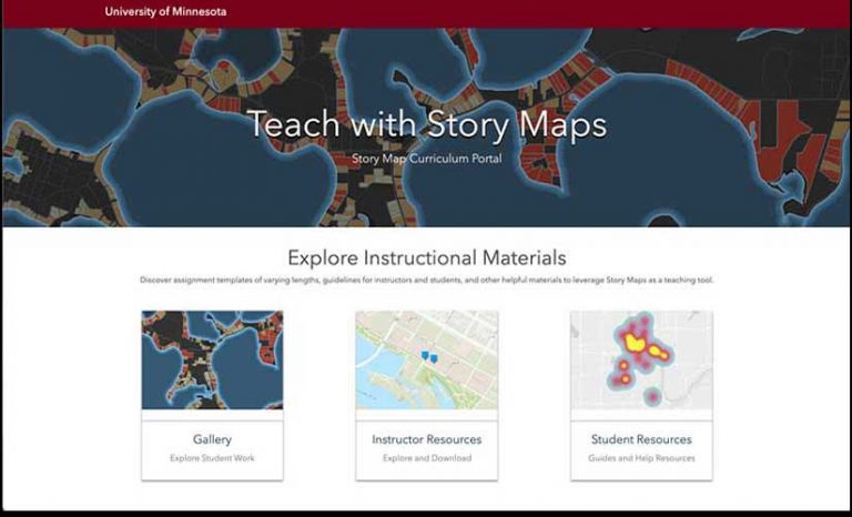 The team’s time in the classroom showed what is necessary to make story map assignments work for any discipline. During this process, the team created a series of resources for instructors and students, which they compiled into an ArcGIS Hub site (storymaps.umn.edu). The site is divided into three sections: a gallery of student work, instructor resources, and student resources.