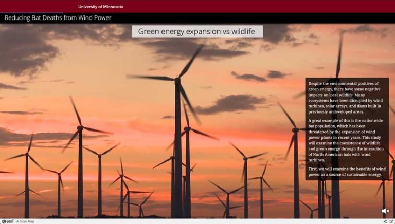 The team also built assignments for an interdisciplinary course on the electric grid system that was cotaught by Jonee Brigham from the Minnesota Design Center and Paul Imbertson, a professor of electrical engineering. Students created story maps as public education projects, which they shared online and presented in a pop-up exhibit at the Bell Museum of Natural History.